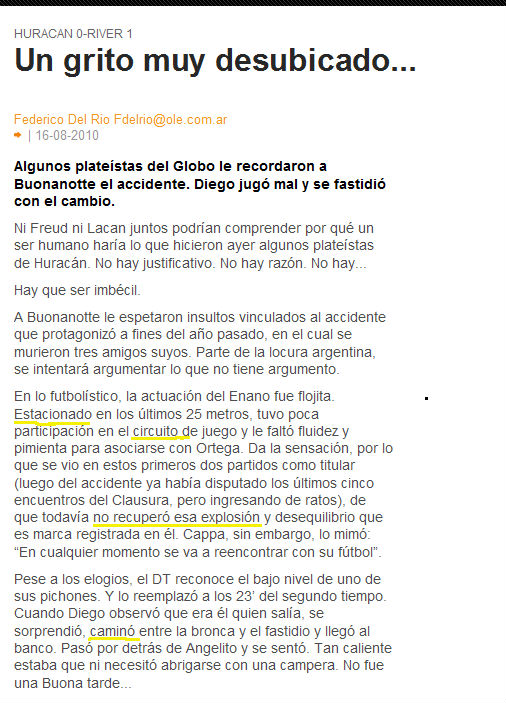 El bienintencionado Federico del River escribe una nota sobre un grito de la platea de Huracán hacia Buonanotte que involucraba alguna alusión al accidente automovilístico que sufrió. Comienza invocando a Freud y Lacan para después despacharse con una sarta de cuestiones morales dignas de la Mirtha Legrand más reaccionaria.