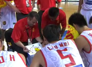 El técnico de China es el norteamericano Bob Donewald. Cuando pide minuto, le da las instrucciones a sus jugadores en inglés, por lo que tiene al lado suyo un chino traductor.