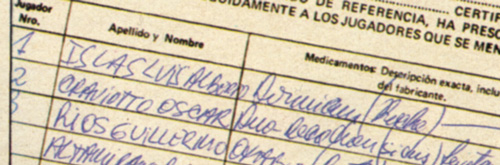 1. DROGAS : en una nota amarillenta titulada «El Camino del Doping», hay un apartado con fotos de las planillas de los médicos de Boca, River e Independiente. El titular es «Esto toman los jugadores».