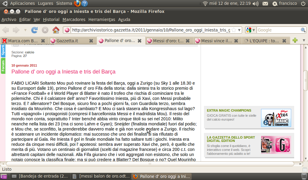 Es así: Messi ganó el balón de oro. No es que confiemos demasiado en ese tipo de premios, pero cuesta creer que los españoles y otros estén llorando tanto por eso. No saben ganar. Salieron campeones y terminan el año llorando por el balón de oro a Messi, un jugador que dicho sea de paso se vanaglorian de poseer. Pero Messi sigue siendo argentino y los europeos siguen teniendo bronca de sus logros por encima de los europeos. Messi fue el mejor. Y es así. Escuché decir en C5N, en donde son fachos hasta para esta boludez, que iniesta s elo merecía más por hacer el gol del mundial, y que Messi le hizo cuatro al Levante, que eso no es mérito. Si no fuera mérito, ese conductor de C5N podría hacerle cuatro al Levante, y lo único que pueda hacer es levantarse a las cuatro para ir a hacer el noticiero.