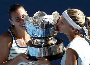 Empecé a cabecear debido a mi exitismo argentino con el 2-6 y 1-4 abajo. Me dormí cuando se pusieron 3-4 y se venía la remontada pero igual pensé entre suenos «se terminó la mentira de Dulko-Penneta». Pero no! Las número 1 del mundo en dobles dieron vuelta el partido y con un 2-6, 7-5 y 6-1 se llevaron su primer Grand Slam, el Australian Open. Cuál es la clave del éxito? Según las chicas: «La clave es no dejar de reír» pero viendo un poco más allá, creo que Gisela tomó el ejemplo de Paola Suarez (quien fue número 1 de dobles junto a Virginia Ruano, ganando 8 grand slams) y formó dupla con una europea con una zona erógena escondida en su nombre. Felicitaciones!