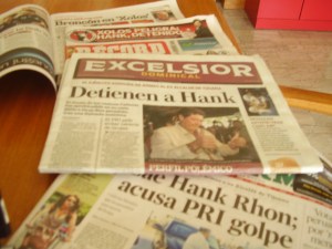 Llegamos y lo primero que vemos son los diarios locales. Los titulares excluyentes en primera plana eran: “Detienen a Hank” (Excelsior), “Xolos peligra; Hank detenido” (diario deportivo Récord); “Cae Hank Rhon; acusa PRI golpe” (Reforma).