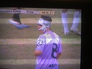 1- Un corte en el arco superciliar izquierdo motivó una especie de momificación del jugador violeta, con una especie de cinta scotch cuyo uso más apropiado es para embalar cajas de cartón: