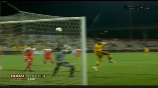 casi se viene el 2do, pero el arquero de Emirates Club vuela y la saca