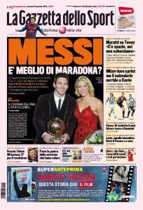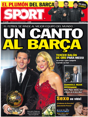 Es mejor que Maradona? Hará el pasito de «Ai, se eu te pego»? Cruyff era rolinga? 42 kilos de qué por Di María? Numerosos interrogantes surgen de las tapas de los diarios del mundo. Pero lo que más se destaca es la presencia de Shakira, una de las estrellas de la noche, quien además de entregar el premio a Lio, debió sufrir el acoso de los impunes miembros de la FIFA, incluso pese a la presencia de su novio Piqué.