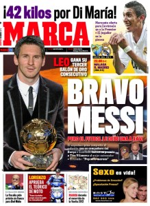Por tercer año consecutivo, Lio Messi se llevó el Balón de Oro. Y una vez más copó las tapas de todos los diarios deportivos del mundo: