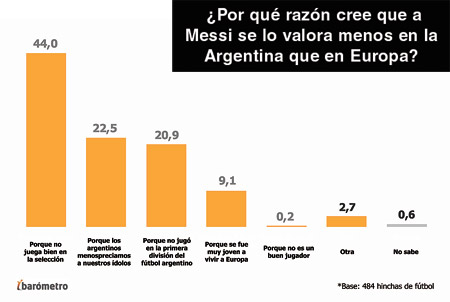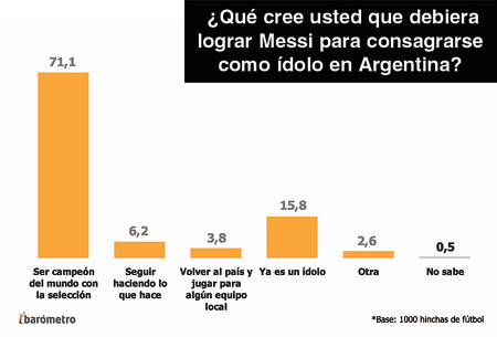 La creencia popular es que Lio es el mejor jugador del mundo del momento y uno de los mejores de la historia. Sin embargo, su excelente rendimiento en el Barcelona no se habría reflejado en la selección argentina, aparentemente por una falta de argentinidad (evidenciada en el no-canto del himno nacional) o porque no es tan bueno o vaya a saber por qué. Eso no lo convierte en ídolo popular y, aparentemente, sería más resistido por el público futbolero que por el no-futbolero. Estas cuestiones pretende clarificar la encuesta en base a un (incomprobable) n de 1.000 personas extraídas de un padrón (?) de 60.000 hinchas.