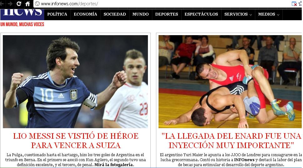 Ayer en el portal infonews.com la sección deportiva estuvo acaparada por dos fotos presentando sendas notas. Así, él se dio gusto de salir al lado del ídolo de todos. Él compartió portada con el hombre del momento. Él pudo estar -virtualmente al menos- ponderado al nivel del hombre que arrancó golazos y emociones de nuestras gargantas el año pasado. Sí, él, el ascendente Lionel Messi (Rosario, 1987) ayer estuvo foto a foto compartiendo pantalla con nuestro gran Yuri Maier, capitan goleador de la Selección Argentina de Kabaddi y luchador medallista en los Juegos Panamericanos.