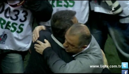 El abrazo entre Senol Günes y el "Imperator" Fatih Terim. Senol DT de la Turquía 3ra en el mundial 2002, y Fatih DT del Galatasaray campeón de la UEFA y la Supercopa de Europa en el 2000