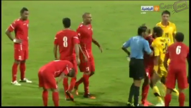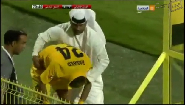 Recibe la roja y se niega a salir del campo. El ayudante del AlWasl se lo quiere llevar pero Rashed se lo quiere comer a él también.