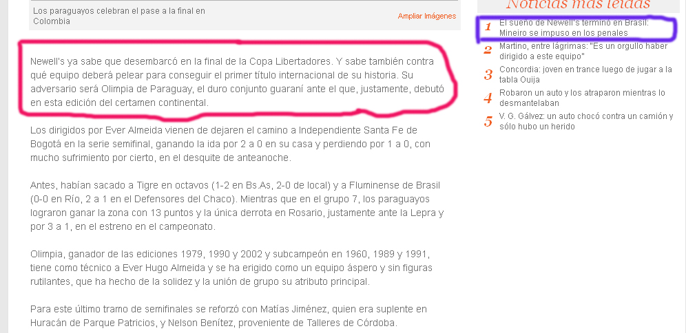 La página de Rosario 3 es una página de origen rosarino, por rosarinos y para rosarinos. Como tales (rosarinos), ayer a la noche estaban prendidos (imagino) al televisor viendo la semifinal entre Newell’s Old Boys de esa ciudad y Atletico Mineiro de esa otra ciudad (Belo Horizonte). Cuando terminó el partido, corrieron a la PC y publicaron la nota correspondiente, para que todo el mundo supiera del resultado obtenido por el equipo del Tat…