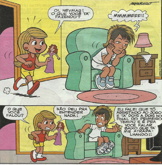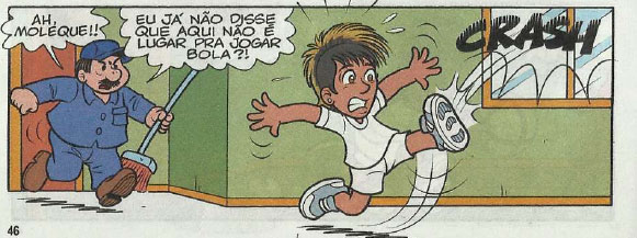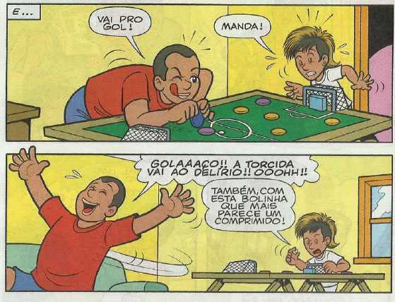 Creo que esconde una dura denuncia a una sociedad sin potreros y donde la gente ha perdido la playa (que en brasilero significa calle) y los chicos tienen que jugar a la play, metaforizada por el futbol con bolitas (seguramente quien escribió la historieta debe tener más de 60 años). Parece inocente y hasta pelotuda pero nos explica claramente la crisis del futbol brasilero (y de todo el país entero). Me hizo llorar, no de tristeza sino debido a que la letra es muy chica y tuve que forzar la vista.