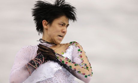 Yuzuru Hanyu se cayó dos veces pero terminó ganando la medalla dorada. La foto representa el instante en que está por disparar la bola de fuego hacia el jurado.