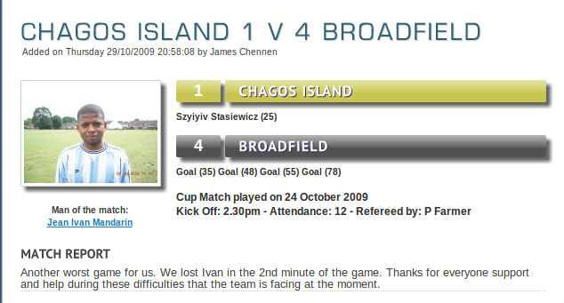 Miembro desde 2003 de la Non-FIFA Board, Islas Chagos ha disputado varios partidos oficiales. Además de los mencionados con Sealand; perdió 0-6 con Merthsam, 1-4 con Broadfield; 1-2 con Furnace Green Galaxy (creo que esta selección es parte de la Non-WORLD Board). Entre sus partidos más resonantes figuran el 4-1 sobre Worth Park Rangers; un 4-1 sobre Ifield Edwards IV; y un espectacular 6-1 a un grande como Raetia. La mayoría de los partidos son prácticamente incomprobables.