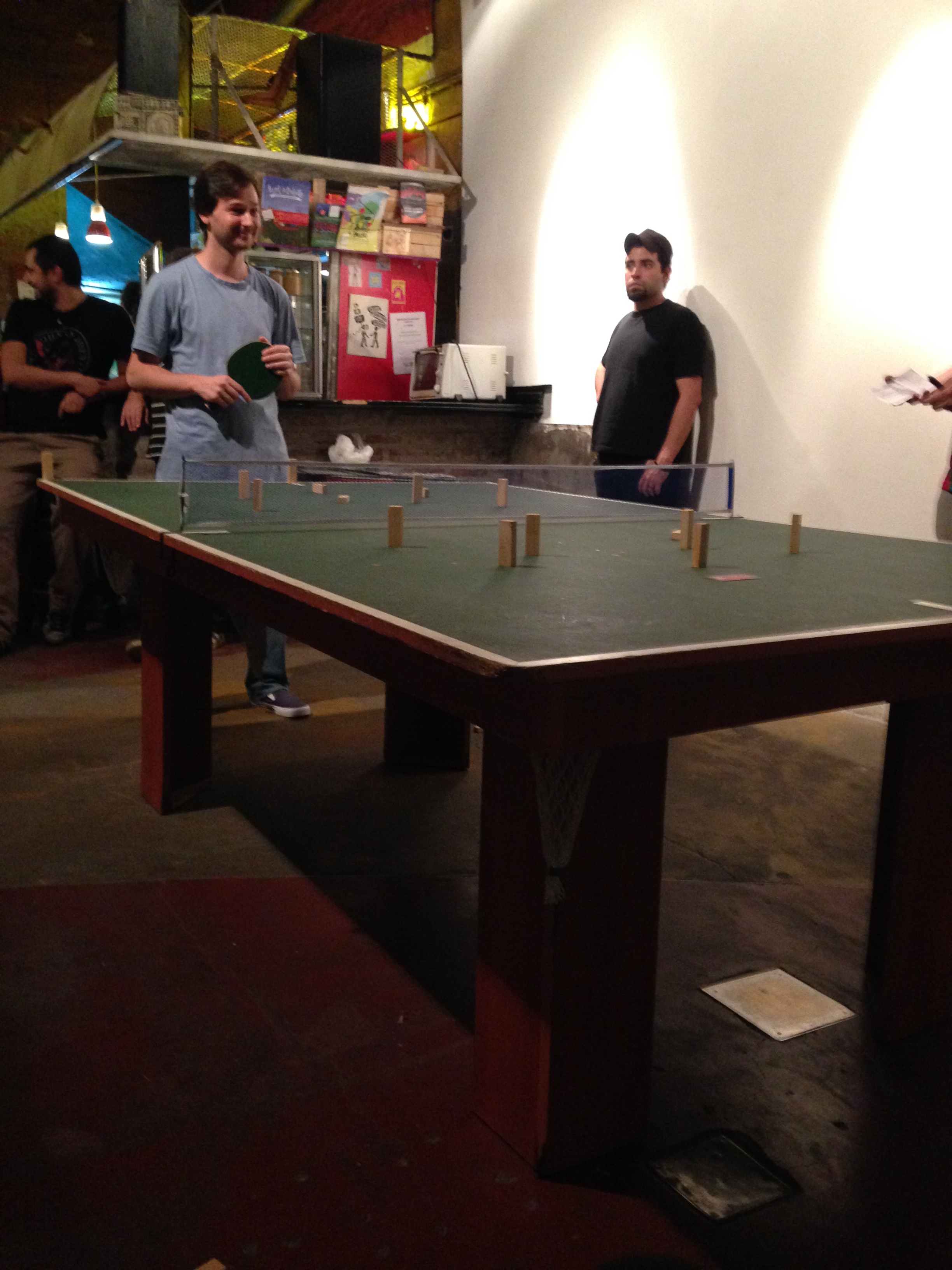Empieza a llegar el público, en su gran mayoría movilizados por sus extremidades inferiores y realizando un movimiento que consistía en anteponer un pie al otro manteniendo siempre uno en el suelo y el otro en balanceo. Primero llegó uno y después fueron llegando los demás. A medida que ingresaban, dieron el presente y se dispusieron a disfrutar de la ceremonia inaugural, esta vez más austera, sin himno pero con una miniclínica que explicó los fundamentos de las variantes utilizadas: ping pong jenga, variante vásica y tradicional. El primero se utilizó en su subversión (…) de resta, y su premisa principal era que cada vez que se tiraba un palito (sea con la pelota o sea con el cuerpo, y sea en el lado propio o en el enemigo) automáticamente se perdía el punto. La variante deleitó a algunos y enojó a otros, quien no dudaron en acusar de fascista a la variante por esquivar los obstáculos, contraviniendo la tradición de apuntarle a los mismos. La segunda, la variante vásica es quizás la variante más vendehumo de la historia. Consistió en un pequeño vaso de telgopor ubicado en el centro de cada lado. En caso de embocar la bola en el vaso y evitar que éste cayera o que la bola volviera a salir se ganaba automáticamente el partido más allá del resultado al momento de la embocada. Por supuesto esto nunca ocurrió , pero cuando la pelota golpeaba en el vaso despertó algunos «uh!!!» , de parte de gente que cayó presa del espejito de color. En la 3era mesa, «la cancha de Almirante Brown» se vieron buenos partidos, a partir de la irregularidad y longitud de la tabla mesa.