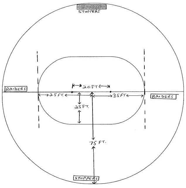 El campo de juego tiene forma circular, con un radio de 22 metros (75 pies). El piso es de tierra (o pasto en el mejor de los casos). Está dividido en 2 semicírculos y la línea que lo divide, en su parte media tiene una zona de 6 metros (20 pies), delimitada por 2 montículos de polvo rojo, llamada PALA, que es la puerta de entrada y salida al campo adversario.