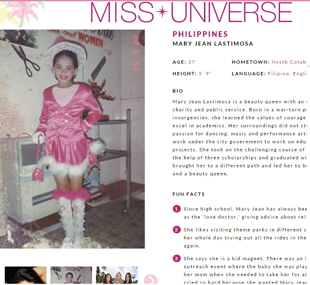 ¿Se pueden ver ya a las concursantes? Claro, en el sitio oficial, pero el link lo ponemos al final así leen toda la nota primero. Es tremendamente denigrante un apartado que hay en el perfil de cada una de las chicas, en las que aparecen «hechos divertidos» (fun facts), del tenor de «una vez se cayó andando en bicicleta y todos sus amigos se rieron mucho» (posta). Lo llamativo es que, en claro gesto de promoción de la degeneración infantil, el abuso deshonesto, etc, el sitio de Miss Universo publica en los perfiles oficiales de las concursantes una foto de cuando eran niñas al lado de la foto actual: