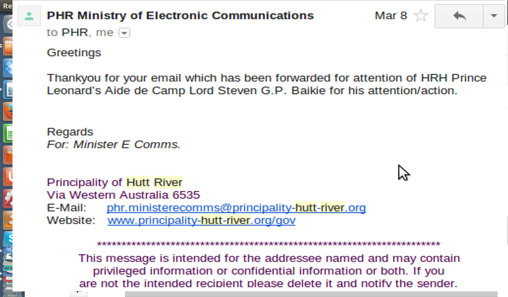 Tiene varios reconocimientos internacionales, como los expedidos por el municipio de de María La Baja, Colombia, por su aporte a la paz mundial y a la diplomacia internacional, y cantidad de poemas y canciones dedicadas. Y en su 40 aniversario, varias autoridades de Australia saludaron al principado (en realidad contestan el mail de invitación a los festejos, los que pueden verse en la web de Hutt River).